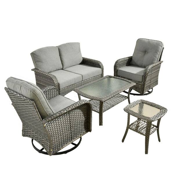 Gray 5-Piece Swivel Wicker Outdoor Lounge Chair Sofa Set with Dark Gray Cushions and 2 Table for Patio, Garden (2-Pack)