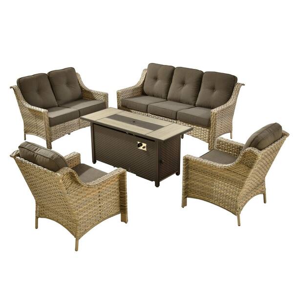 Harpera 5-Piece Wicker Outdoor Patio Conversation Sofa Seating Set with Black Cushions and Metal Fire Pit