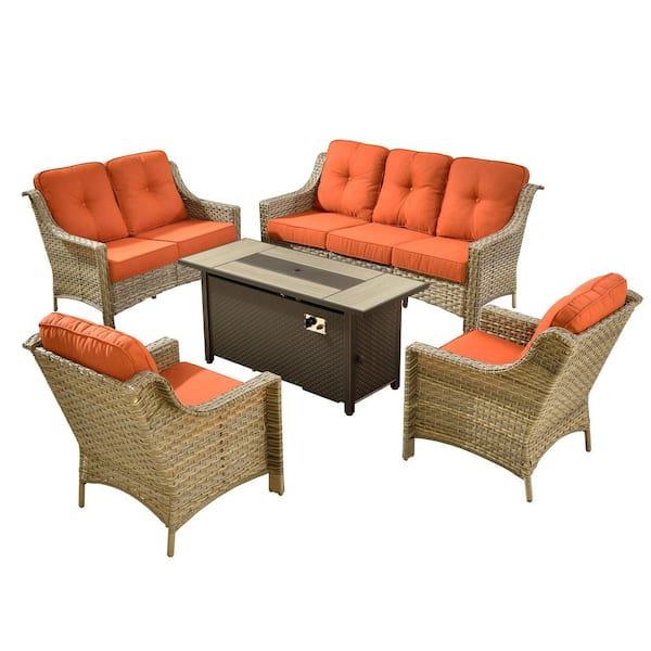 Harpera 5-Piece Wicker Outdoor Patio Conversation Sofa Seating Set with Bold-stripe Orange Red Cushions,Metal Fire Pit