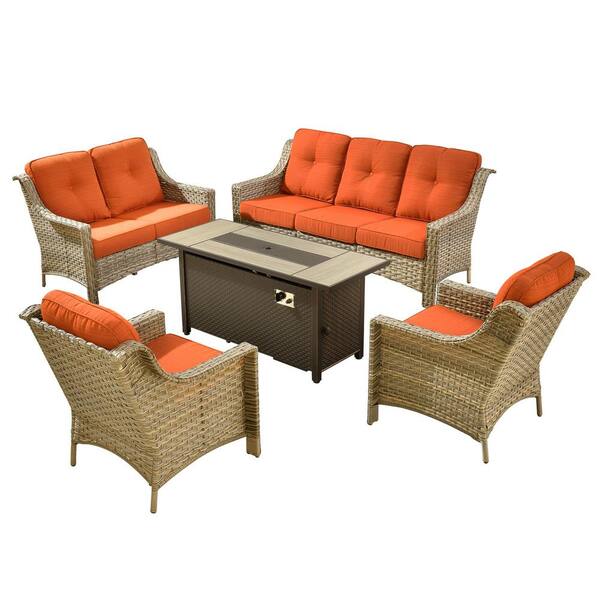 Harpera 5-Piece Wicker Outdoor Patio Conversation Sofa Seating Set with Orange Red Cushions and Metal Fire Pit
