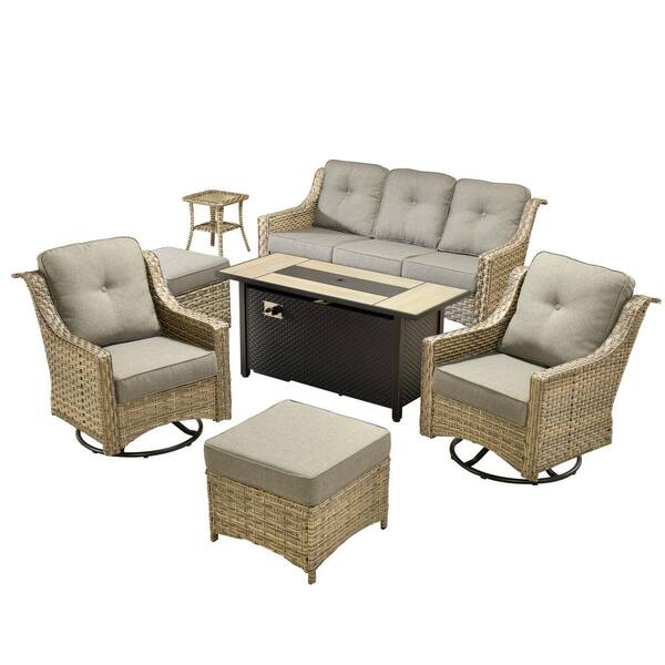 Harpera 7-Piece Wicker Outdoor Patio Conversation Sofa Seating Set with Swivel Rocker, Dark Gray Cushions,Metal Fire Pit