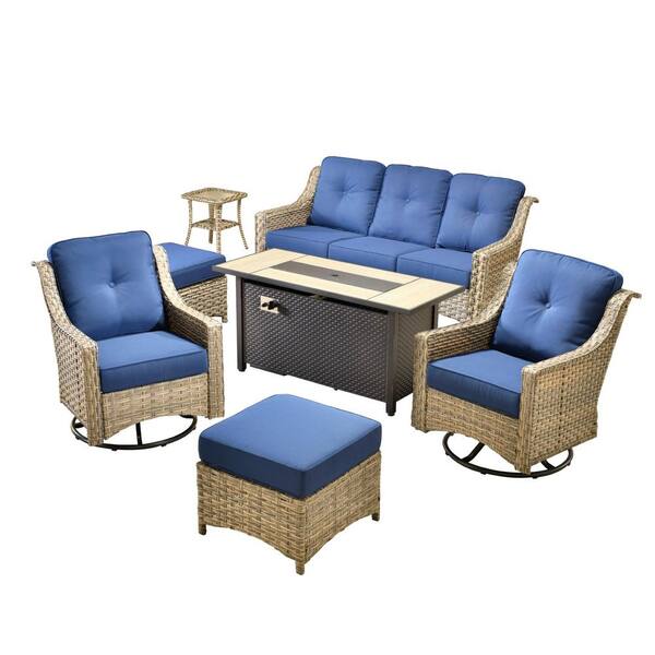 Harpera 7-Piece Wicker Outdoor Patio Sofa Seating Set with Swivel Rocker, Navy Blue Cushions, Metal Fire Pit