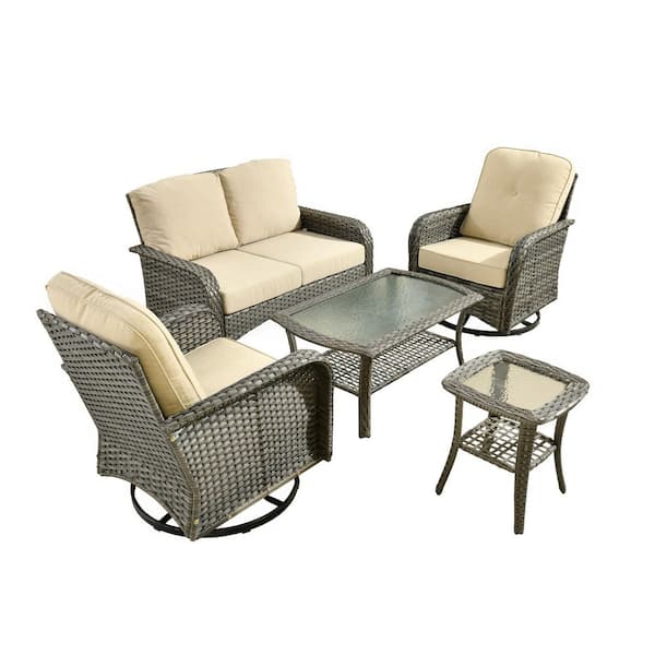 Hot Sale Valora 5-Piece Gray Wicker Outdoor Sectional Set with Beige Cushion, Coffee Table and Side Table for Deck Patio