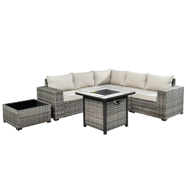 Lanora Gray 7-Piece PE Rattan Wicker OutdoorPatio Conversation Set with Beige Cushion and Fire Pit Table for Garden