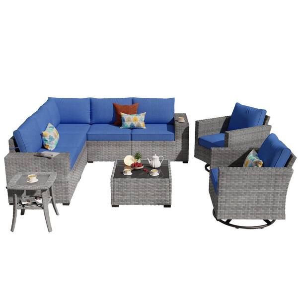 Lanora Gray 9-Piece PE Rattan Wicker Outdoor Sectional Set Sofa Set with Navy Blue Cushion, Table & Rocking Chair Set