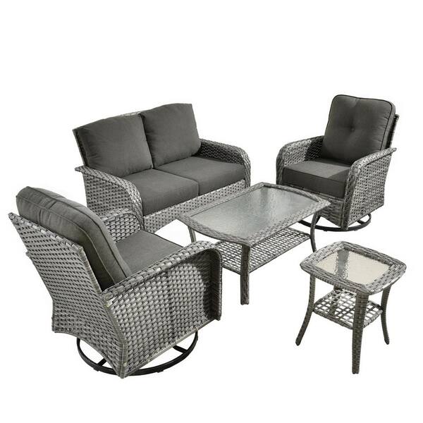Noah Gray 5-Piece Wicker Outdoor Patio Conversation Sofa Seating Set with Rocking Chairs and Black Cushions
