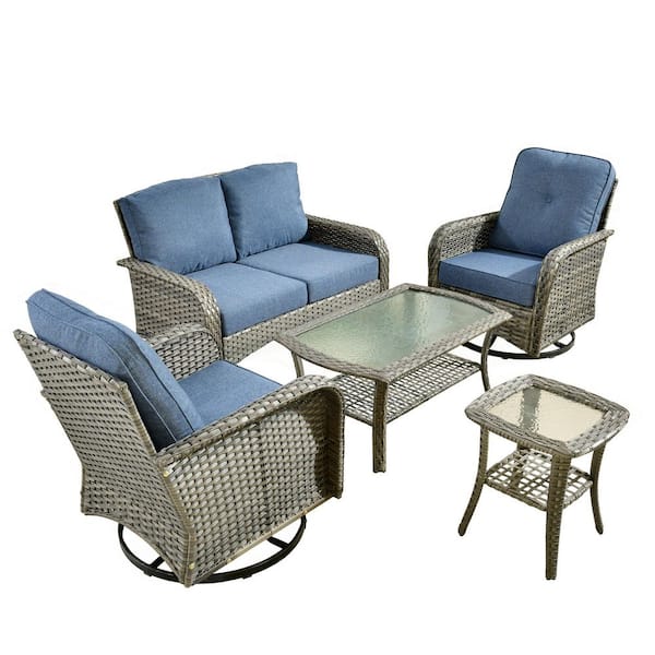 Noah Gray 5-Piece Wicker Outdoor Patio Conversation Sofa Seating Set with Rocking Chairs and Denim Blue Cushions