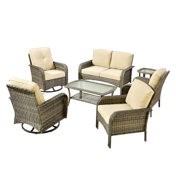 Noah Gray 7-Piece Wicker Outdoor Patio Conversation Comfortable Sofa Set with Swivel Chairs and Beige Cushions