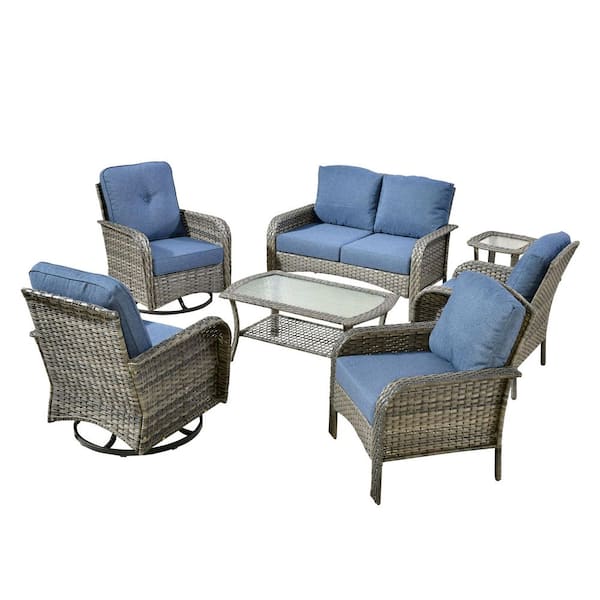 Noah Gray 7-Piece Wicker Outdoor Patio Conversation Comfortable Sofa Set with Swivel Chairs and Denim Blue Cushions