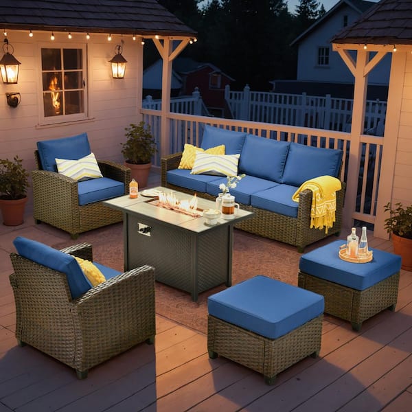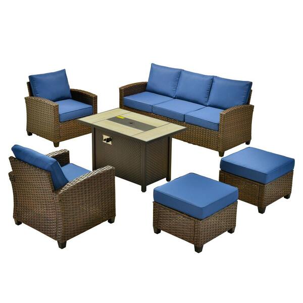 Serena Grey 6-Piece Wicker Outdoor Patio Furniture Conversation Sofa Set with Metal Fire Pit and Navy Blue Cushions