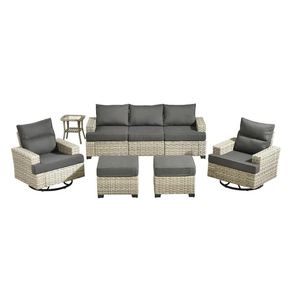 Silvae Gray 8-Piece Wicker Outdoor Sectional Set Patio Conversation Sets with 360°Rocking Chair & Black Cushion &Ottoman