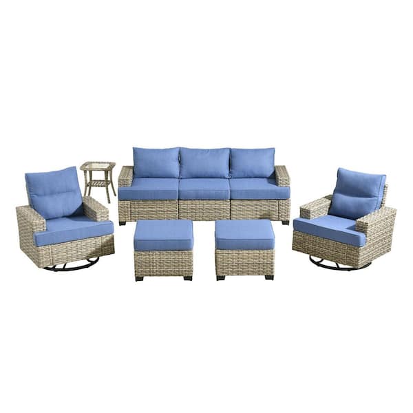 Silvae Gray 8-Piece Wicker Outdoor Sectional Set Patio Conversation Sets with Rocking Chair & Denim Blue Cushion&Ottoman