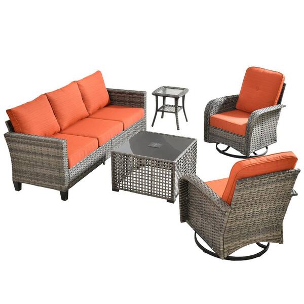 Thallo Gray 5-Piece Wicker Outdoor Sectional Patio Conversation Set with Orange Red Cushions, Rocking Chair and Ottomans