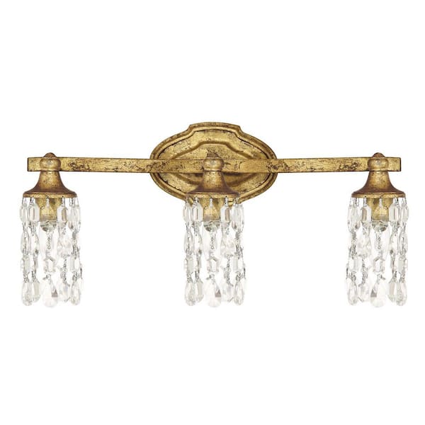 Blakely 20.5 in. W x 10 in. H x 6 in. E 3-Light Antique Gold Vanity Light with Crystal Shades