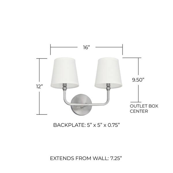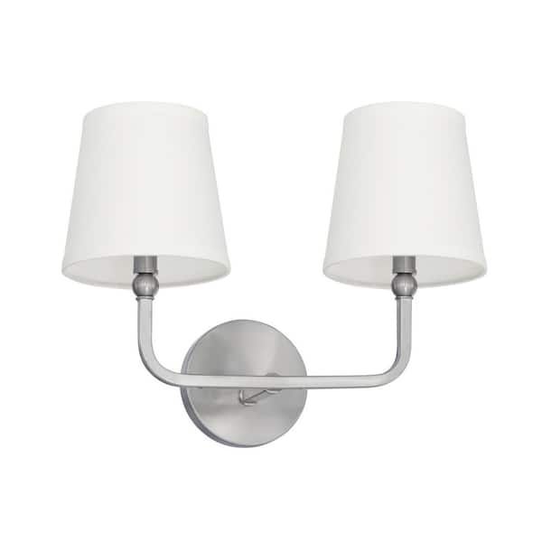 Dawson 16 in. W x 12 in. H x 7 in. E 2-Light Brushed Nickel Vanity Light with White Fabric Shades