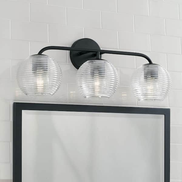 Dolan 24.5 in. W x 9.5 in. H 3-Light Vanity Light in Matte Black with Clear Ribbed Glass