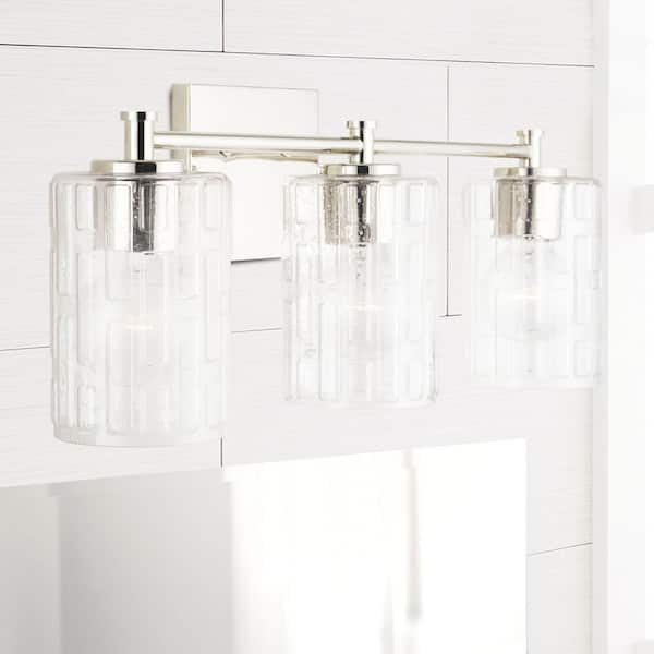 Emerson 23 in. W x 9 in. H x 7 in. E 3-Light Vanity Light with Seeded Embossed Glass in Polished Nickel