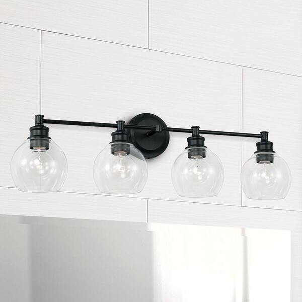 Mid Century 32 in. W x 10 in. H x 7 in. E 4-Light Matte Black Vanity Light with Clear Glass