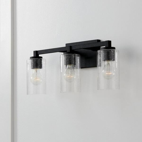Ravenwood 23 in. W x 9.5 in. H x 5.5 in. E 3-Light Black Iron Vanity Light with Clear Seeded Glass
