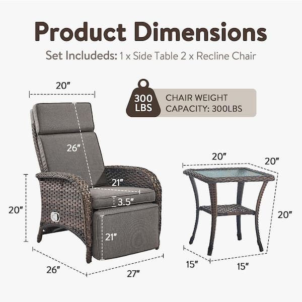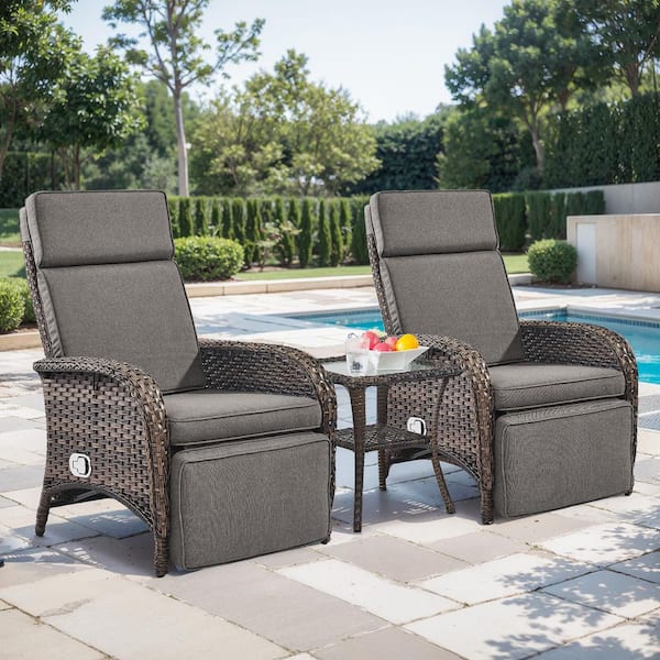 Carlos Brown Wicker 3-Piece Outdoor Chaise Lounge Chair, Patio Adjuestment Recliner Set with Gray Olefin Soft Cushion