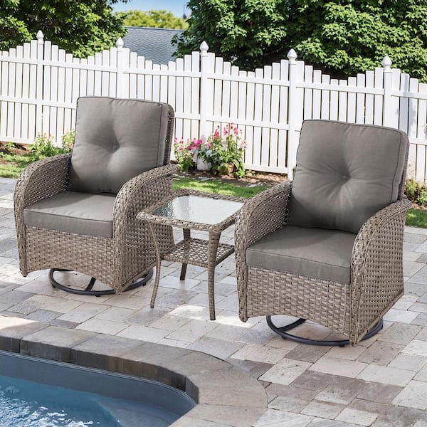 Carlos Gray 3-Piece Steel Outdoor Swivel Glider Wicker Patio Conversation Deep Seating Set with Gray Cushions
