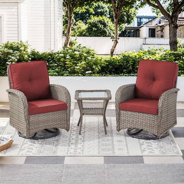 Carlos Gray 3-Piece Steel Outdoor Swivel Glider Wicker Patio Conversation Deep Seating Set with Red Cushions