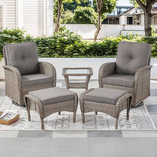 Carlos Gray 5-Piece Wicker Patio Conversation Set Outdoor Swivel Chair Set with Ottomans with CushionGuard Gray Cushions