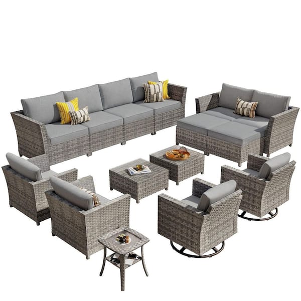Carnation 15-Pieces Wicker Patio Conversation Sectional Sofa Set with Dark Gray Cushions and Swivel Rocking Chairs