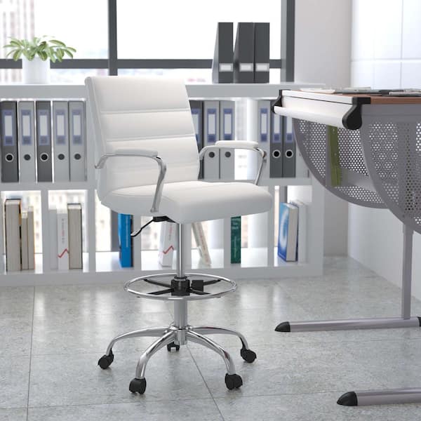 White/Chrome Whitney Mid-Back Swivel Leather Soft Drafting Chair, Adjustable Height Padded Office Chair with Foot Ring
