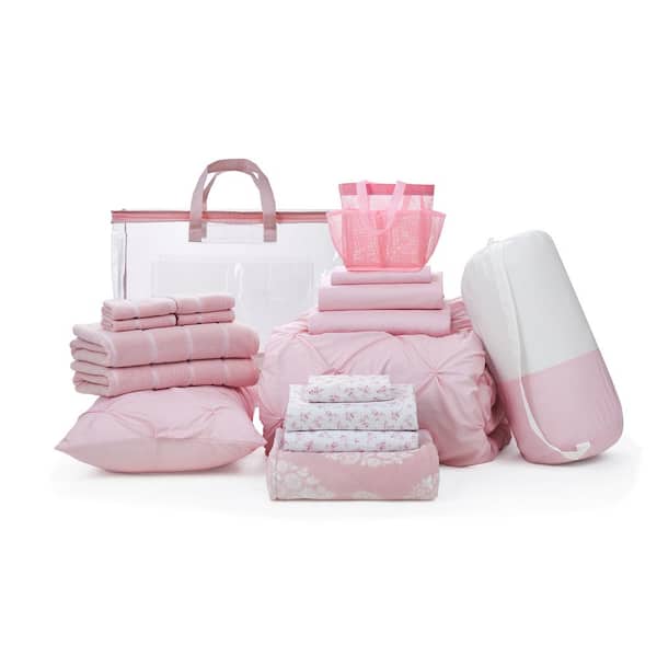 College Dorm Kit 18-Piece Pintuck Light Pink Twin XL Polyester Bed in a Bag