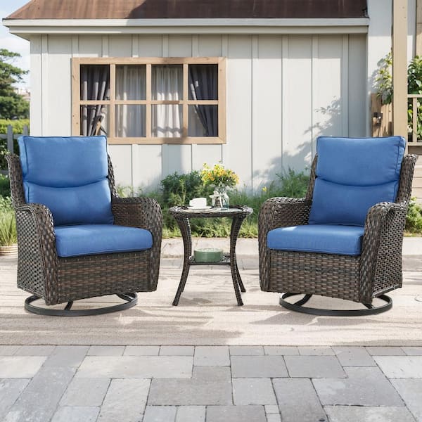 Carolina Brown Wicker 3-Piece Outdoor Swivel Glider Set Outdoor Conversation Set with Blue Thick Cushions