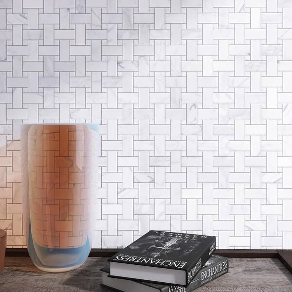 Carrara White Dot 12.01 in. x 12.01 Basketweave Polished Marble Mosaic Tile Sample