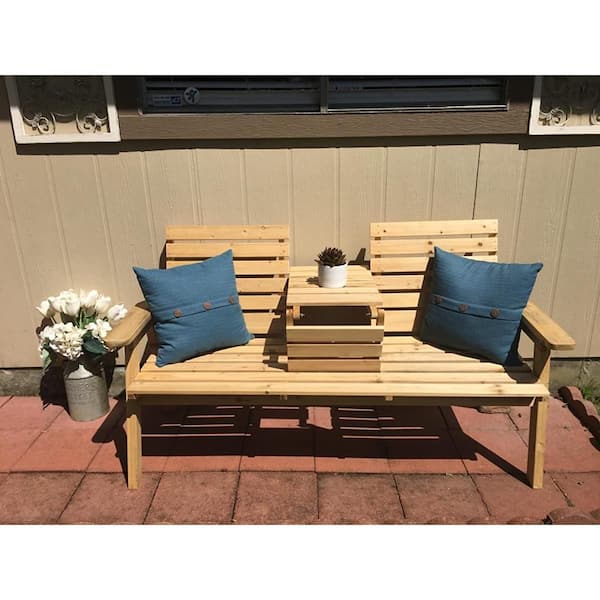 Cedar/Fir Log Wood Patio Garden Bench with Foldable Table, Outdoor Wooden Porch 3-Seat Bench Chair, Natural