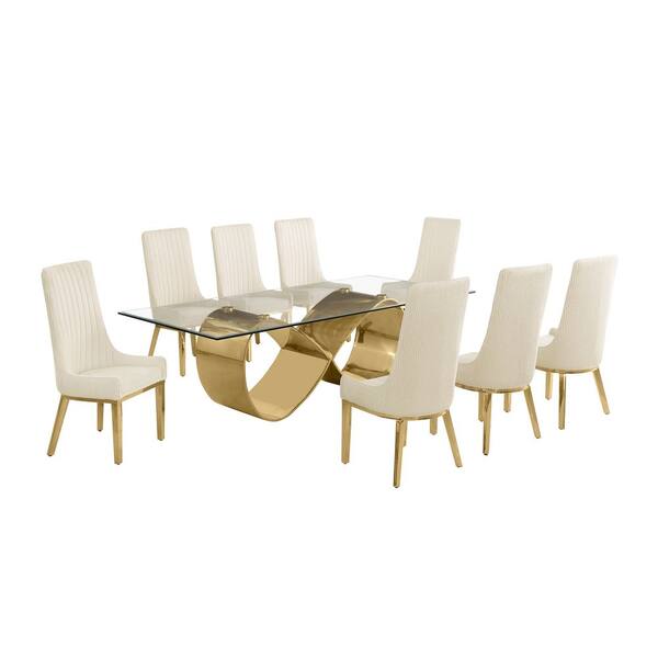 Celia 9-Piece Clear Tempered Glass Top with Gold Stainless Steel Base Dining Set with 8 Cream Fabric Chairs