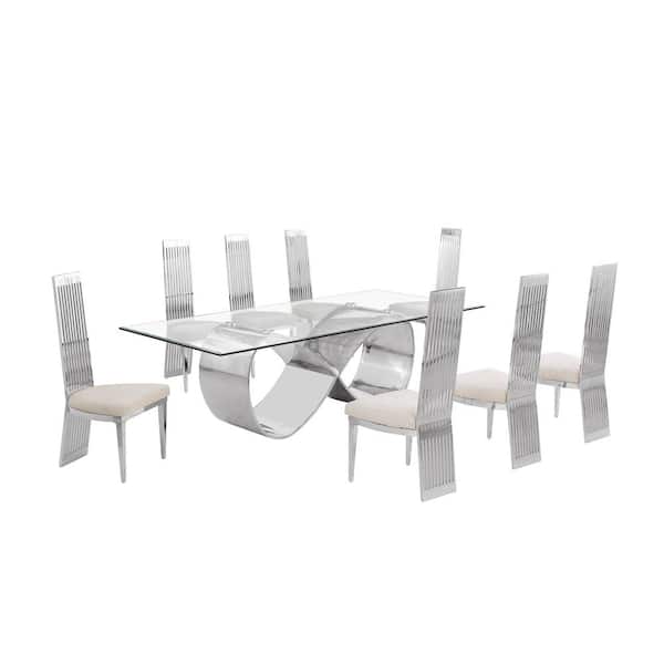 Celia 9-Piece Clear Tempered Glass Top with Stainless Steel Base Dining Set with 8 Chairs