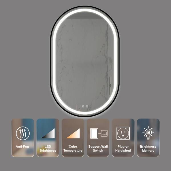 20 in. W x 32 in. H Oval Framed Anti-Fog LED Light Bathroom Vanity Mirror Black, Wall Switch Control