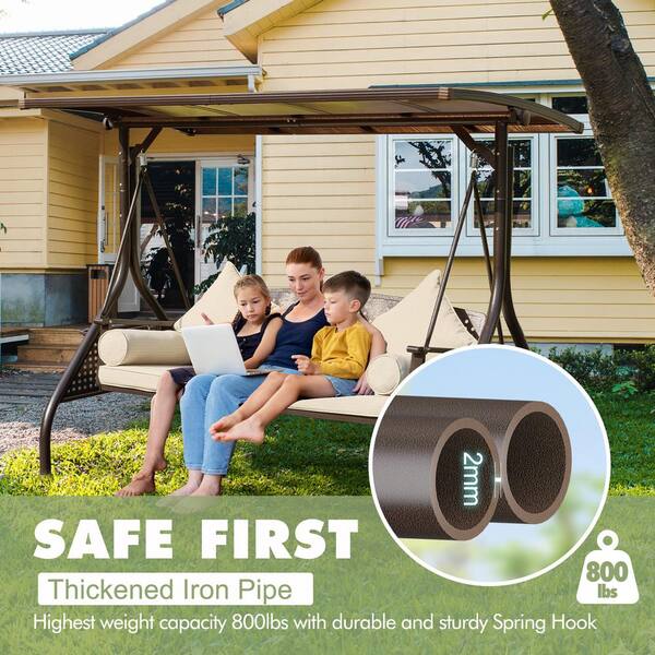 3-Person Metal Patio Swing with Beige Cushions and Adjustable Canopy