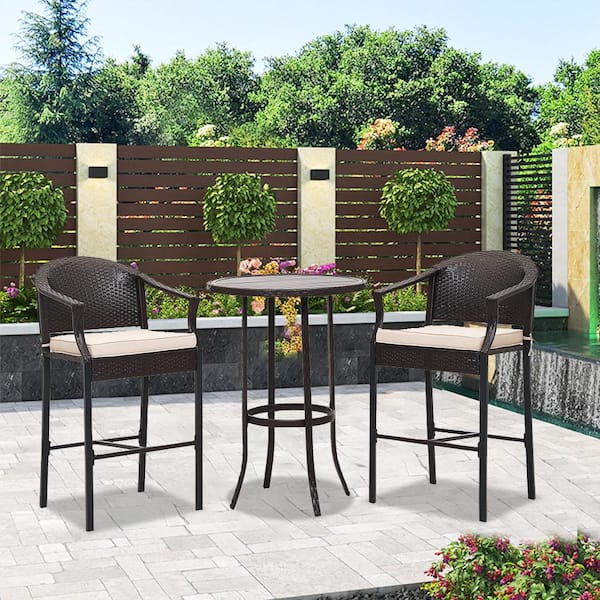 3-Piece PE Wicker Outdoor Serving Bar Set Patio Conversation Set with Beige Cushions