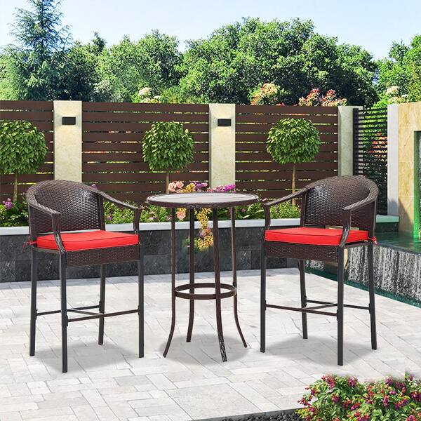 3-Piece PE Wicker Outdoor Serving Bar Set Patio Conversation Set with Red Cushions