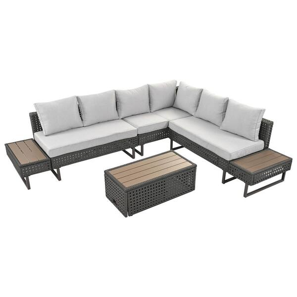4-Piece Rattan Wicker Diamond Weave Outdoor Sofa Sectional Set with Extendable Coffee Table and Gray Cushions