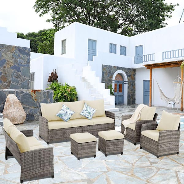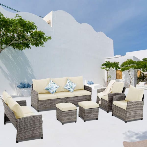 6-Piece Gray Wicker Outdoor Sectional Set with Beige Cushions