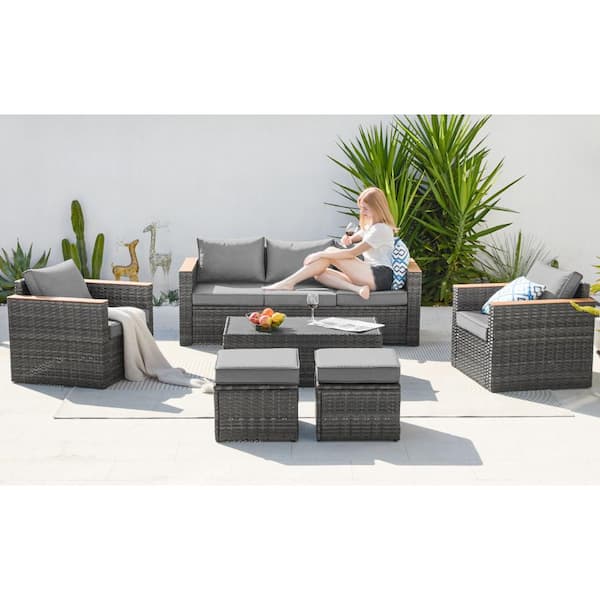 6-Piece Gray Wicker Outdoor Sectional Sofa Set with Rectangular Table and Gray Cushions