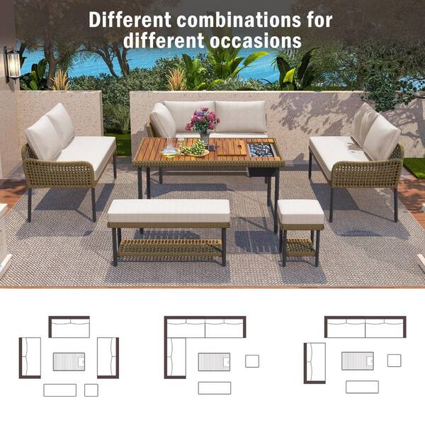 6-Piece Wicker Outdoor L-Shaped Ice Box Acacia Wood Table Furniture Sectional Set with Beige Cushion and Rope Bench