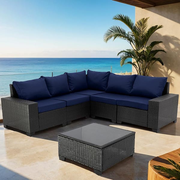 6-Pieces Black Wicker Outdoor Sectional Set with Dark Blue Cushions and Coffee Table