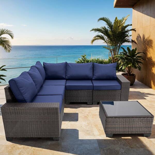 6-Pieces Brown Wicker Outdoor Sectional Set with Dark Blue Cushions and Coffee Table