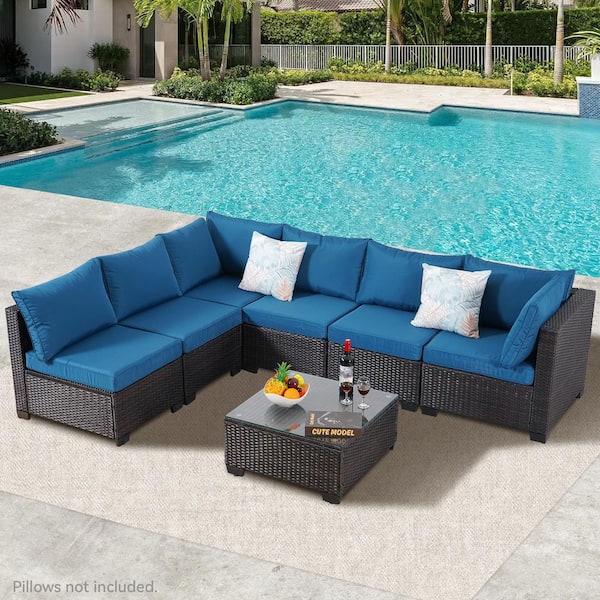 7-Piece Brown Wicker Outdoor Sectional Set with Blue Cushions and Coffee Table