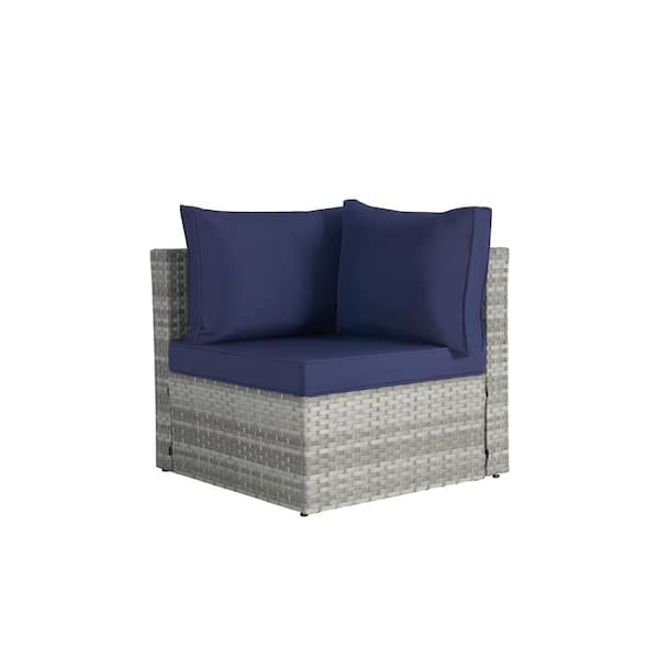 7-Piece Gray Rattan Wicker Outdoor Patio Conversation Sectional Sofa with Water Resistant Navy Blue Cushions