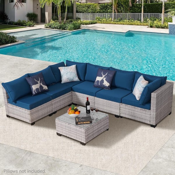 7-Piece Gray Wicker Outdoor Sectional Set with Blue Cushions and Coffee Table