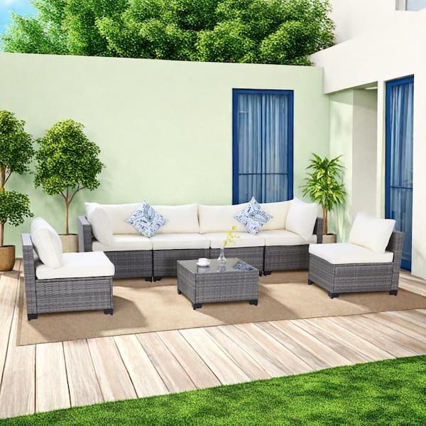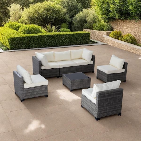 7-Piece Wicker Outdoor Sectional Set with Beige Cushions and Table
