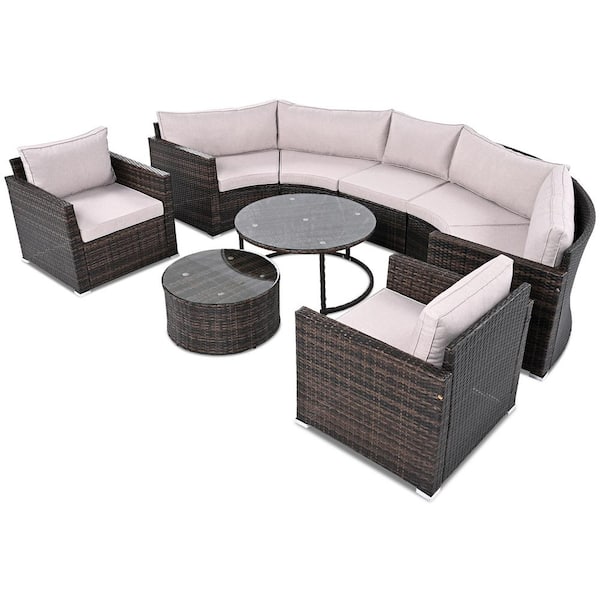 9-Piece Brown Wicker Outdoor Half-Moon Sectional Set with Beige Cushions and Round Table